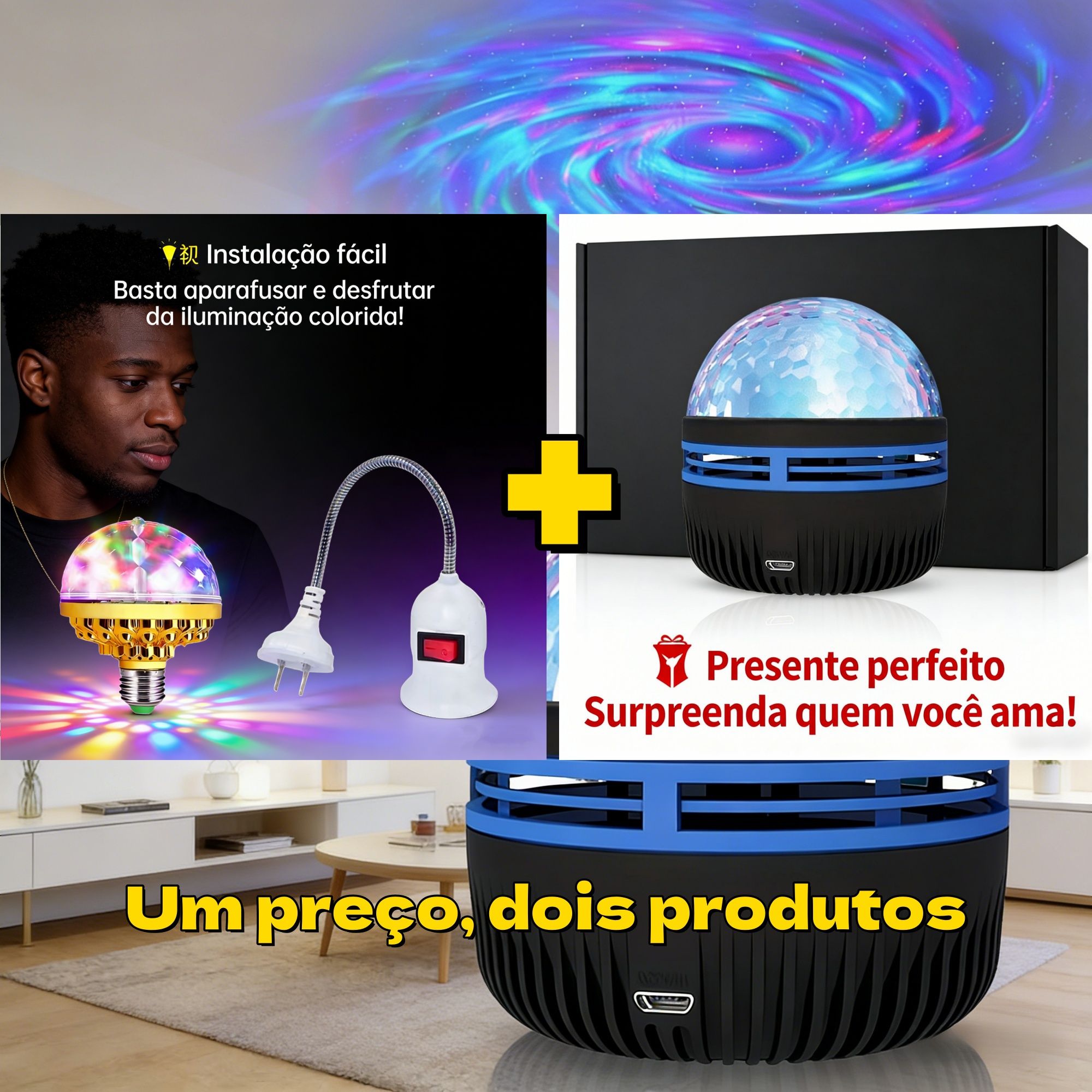 ✨ 2 em 1 para transformar a sua noite em Luanda! ✨Para um momento relaxante ou uma festa animada! Conheça esta combinação perfeita de iluminação ambiente: uma cria um céu estrelado relaxante, a outra traz a energia da pista de dança para a sua sala de estar.Um preço, dois produtos